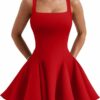 - Features:This square neck sleeveless mini dress,off-shoulder, high waist, ruffled hem, A-line, solid color, a must-have short skirt for your summer wardrobe.