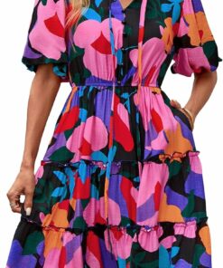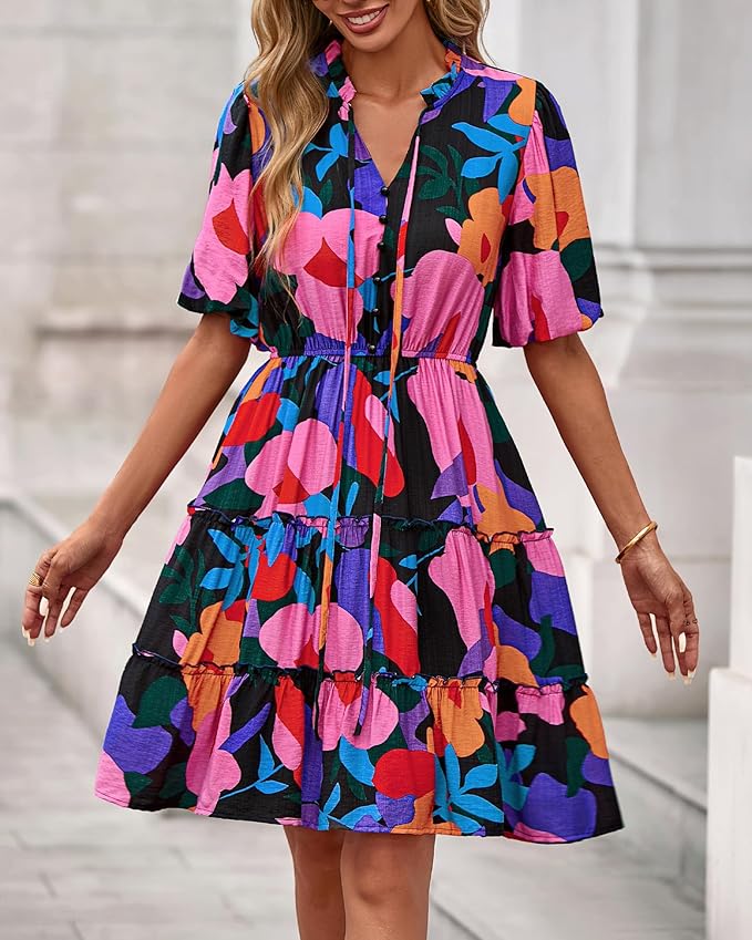 - Cute Floral Mini Dresses – Ruffles And Drawstrings Elevate The Playful Sophistication Through The Charming Ruffle Details Of This Beach Dress For Holiday, Adding a Touch Of Fashion To Your Look. Floral Pattern, V Neck And Decorative Buttons Help Enhance Your Femininity