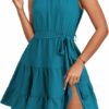 - Ruched designed at neckline, high waist with tie knot at waist, sleeveless ruffle layered hem summer dress for women